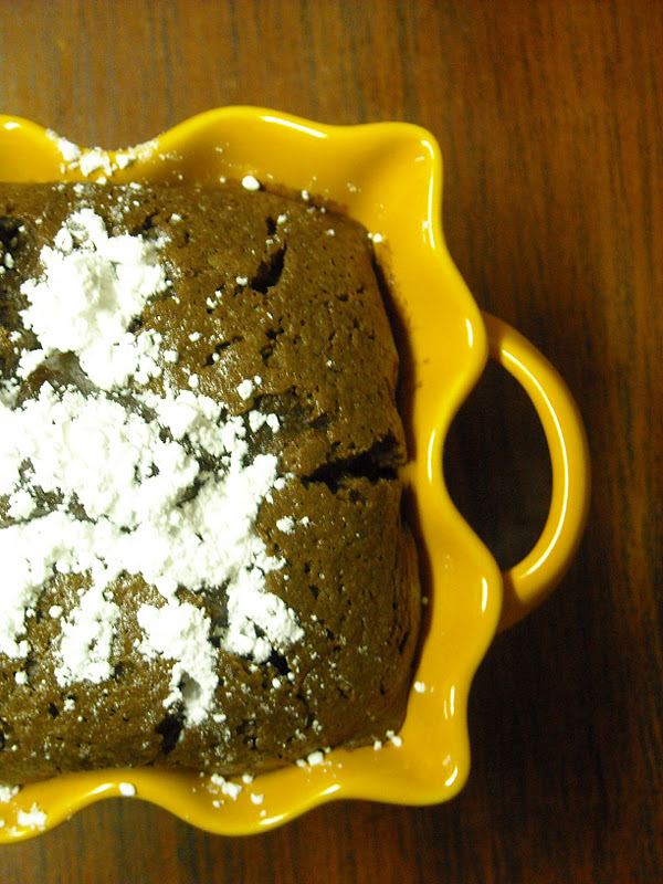 Preheat oven to 375 degrees. Melt chocolate and butter; let cool 10 minutes. In separate bowl, mix 1 egg and sugar with whisk. Add flour and whisk. Add remaining egg and whisk. Add egg mixture to chocolate mixture. Pour into individual ramekins. Bake until just done, about 15-20 minutes, just until the top looks cooked across. Leave it in too much longer and the middle will over cook (mine were perfect after 16 minutes, interior will be melting). Sprinkle with powdered sugar and if desired serve with vanilla ice cream.